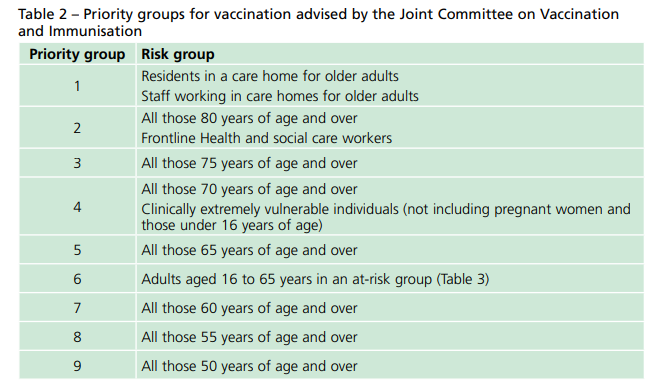 The Joint Committee of Vaccination and Immunisation (JCVI) have set out a prioritisation for persons at risk. JCVI ranked the eligible groups according to risk, largely based on prevention of COVID-19-specific mortality.